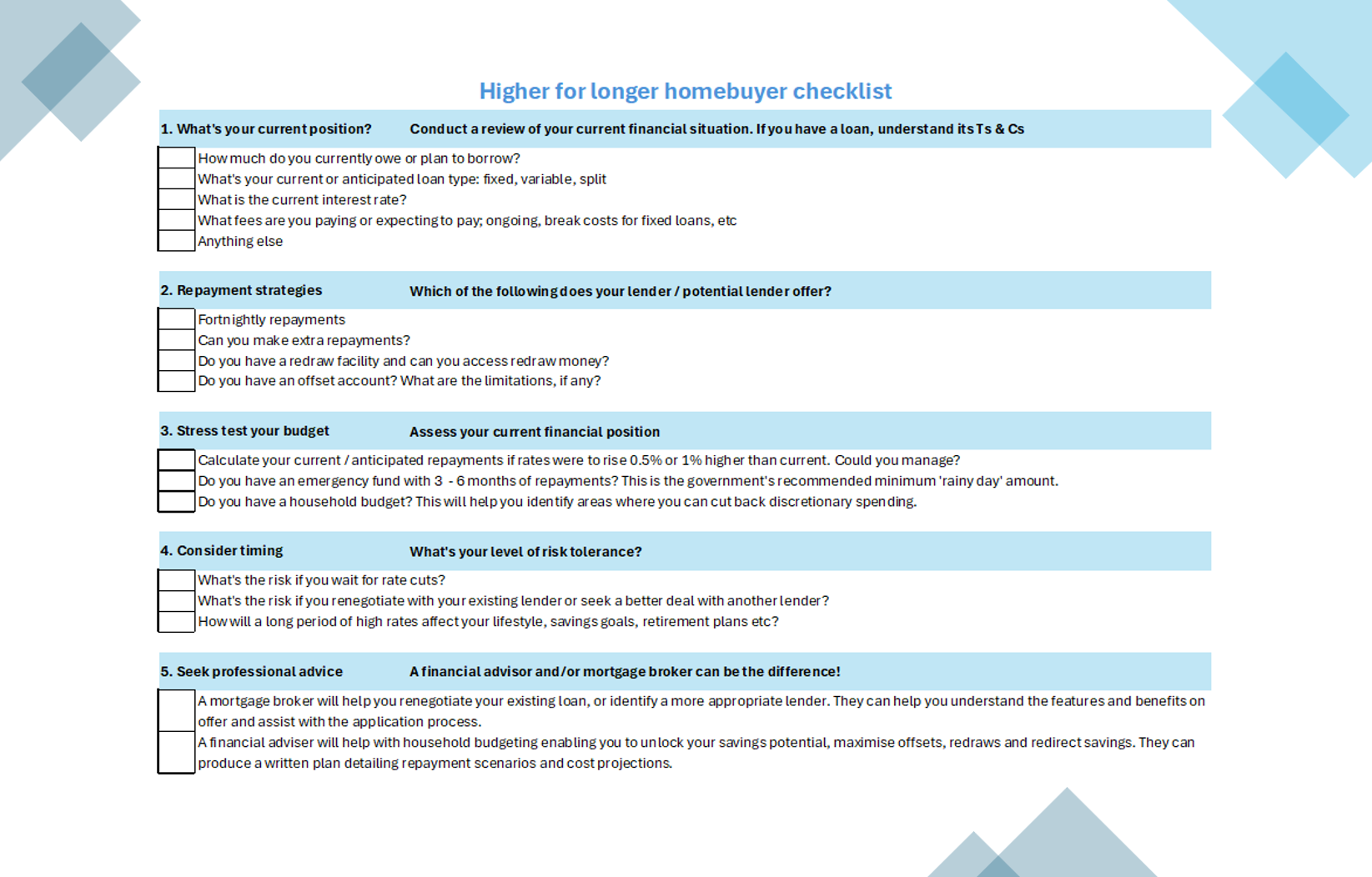 We’ve put together a five-point checklist you can use to evaluate your financial position in relation to your current, or future, housing loan. Some of these points you may have already considered, others you may not have. But as we buckle-up in preparation for what could be higher-for-longer rates, it’s worth taking a look.